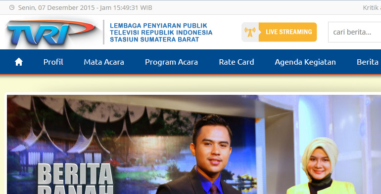 Project tahun 2015. Merupakan website live streaming TVRI SUMBAR. Televisi Republik Indonesia Stasiun Sumatera Barat yang merupakan lembaga penyiaran publik wilayah Sumatera Barat berupaya memperbaharui teknologi penyiarannya. Tidak hanya disiarkan melalui kanal reguler saat ini juga telah dibuat mengudara secara online melalui media website resmi TVRI Sumbar. Dan dilengkapi juga dengan fitur-fitur yang mendukung tupoksi TVRI Sumbar dalam menjalankan operasionalnya.