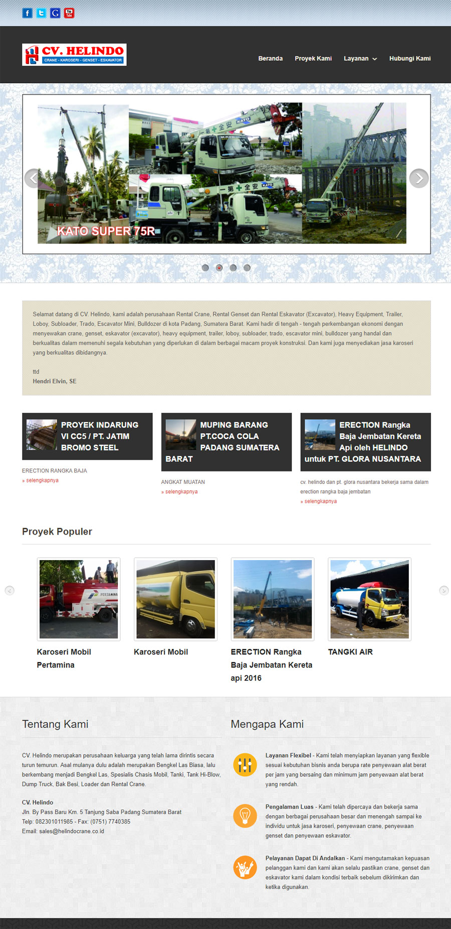Project tahun 2016. Merupakan website resmi Helindo Crane & Karoseri. Sebagai salah satu media untuk memasarkan produk dan jasa Helindo Crane & Karoseri secara online dan juga memperkuat citra perusahaan dimata konsumen dan dimata para relasi perusahaan.