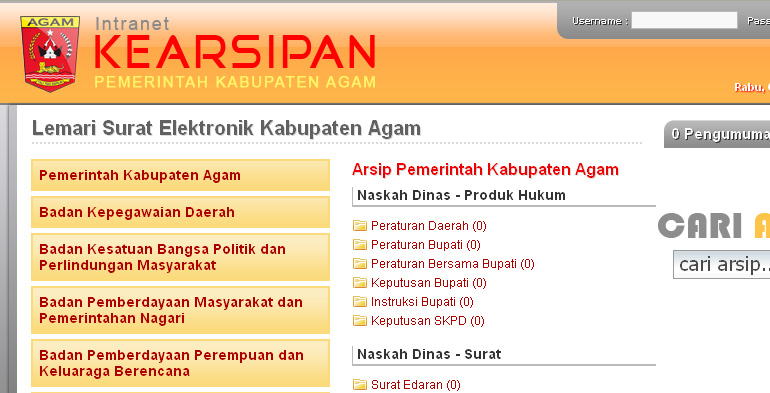 Project tahun 2010. Merupakan Aplikasi Intranet Kearsipan Pemerintah Kabupaten Agam. Sebagai salah satu institusi pemerintahan di Sumatera Barat yang memiliki banyak data dan arsip tentunya sebuah aplikasi yang mengelola kearsipan menjadi kebutuhan bagi Pemerintah Kabupaten Agam.